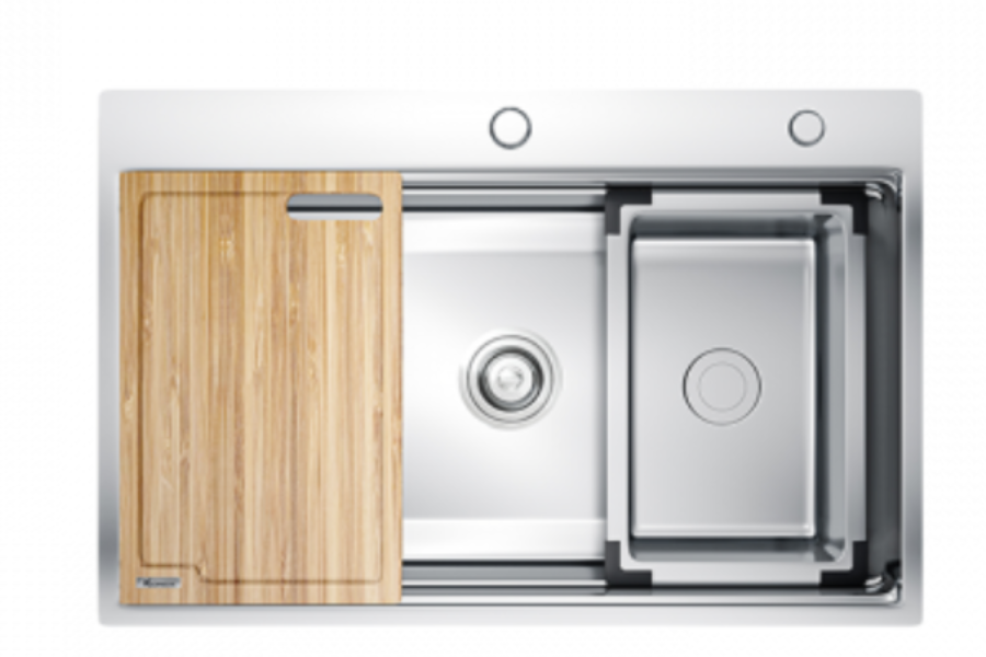 Điểm nhấn giá trị nhất của sản phẩm là thiết kế gờ hạ bậc, tích hợp các phụ kiện thông minh như thớt gỗ và chậu rửa nhỏ (colander). Điều này cho phép bạn thực hiện mọi thao tác từ rửa, sơ chế, thái gọt đến làm ráo thực phẩm ngay trên bề mặt chậu, giúp tối ưu hóa quy trình làm việc và giữ cho mặt bàn bếp luôn sạch sẽ, gọn gàng.
