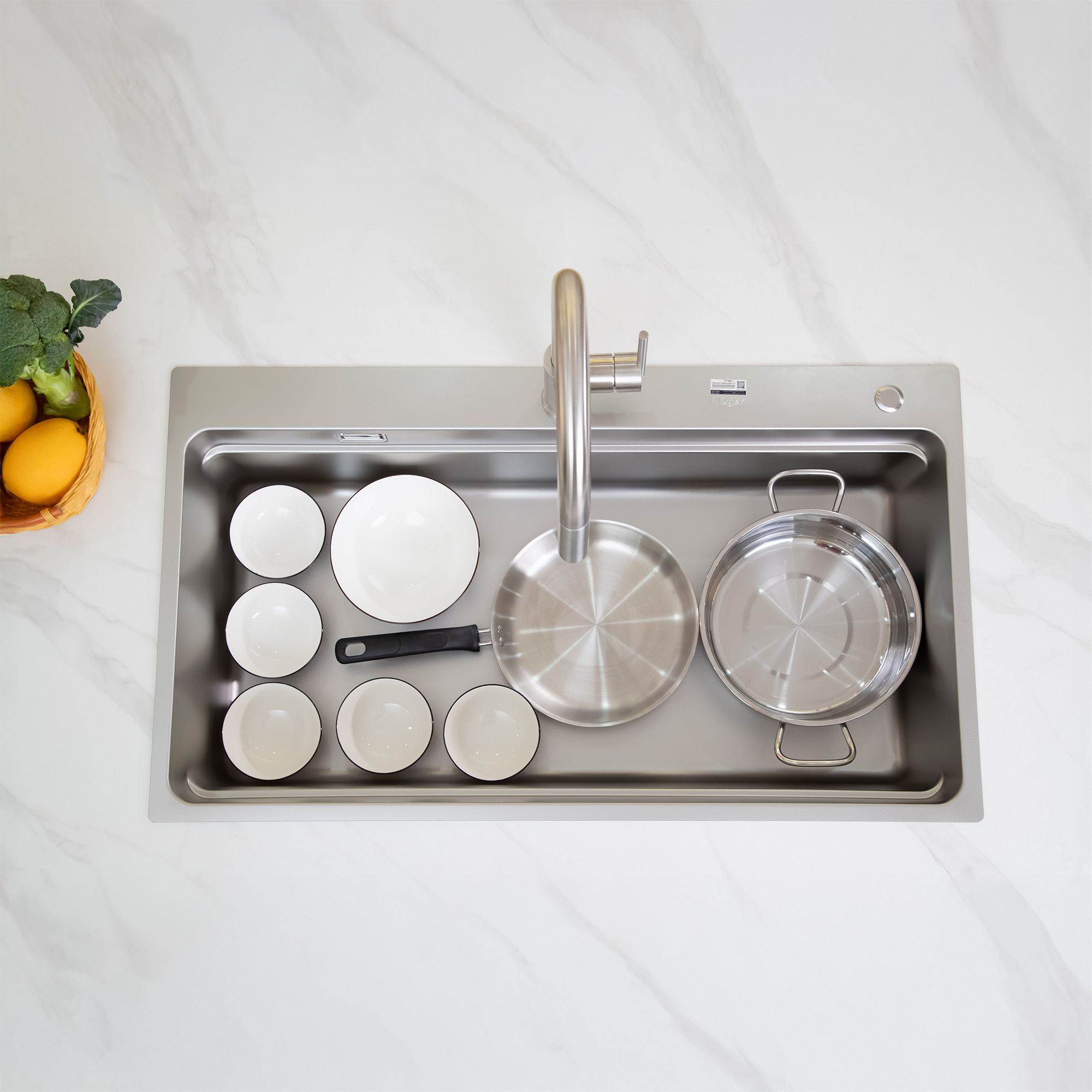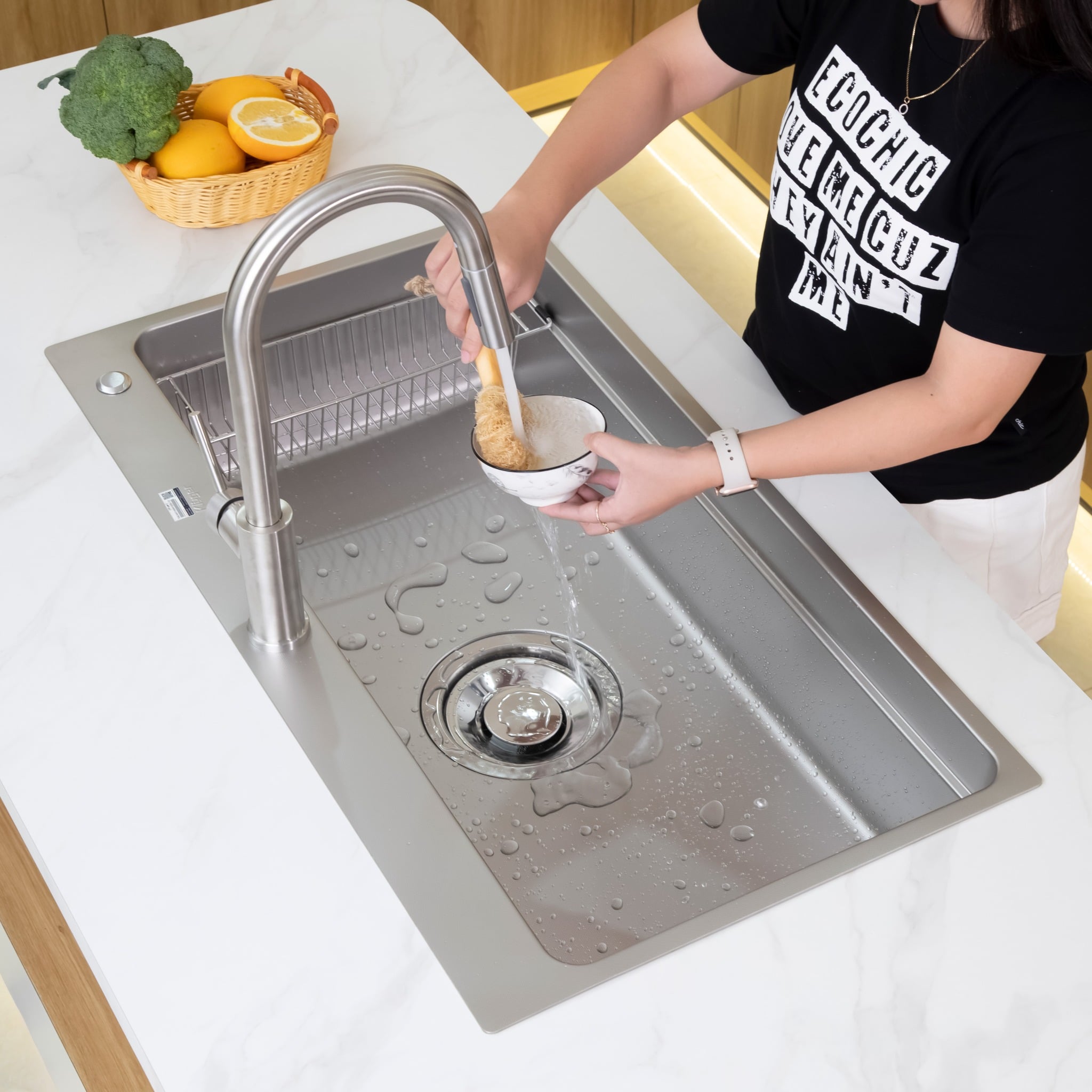 Dễ dàng lau chùi, duy trì vẻ đẹp: Bề mặt xước mờ (brushed finish) không chỉ tăng tính thẩm mỹ mà còn giúp che giấu các vết xước nhỏ và hạn chế bám vân tay, dầu mỡ. Việc vệ sinh chậu trở nên đơn giản, giữ cho chậu luôn sáng bóng.