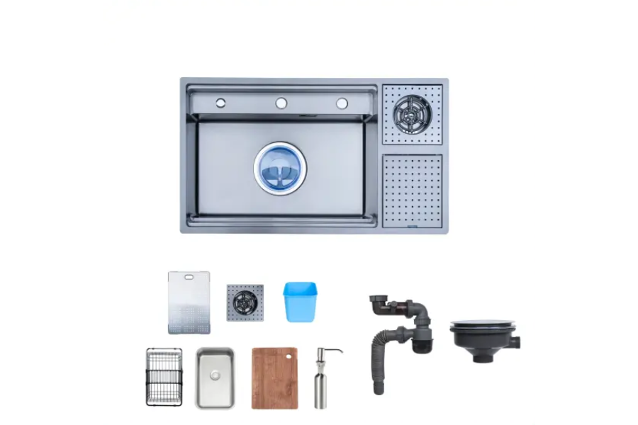 Phụ kiện đi kèm | Gồm: Thớt gỗ + Xịt cốc + Hố rác + 2 Tấm đậy + Rổ LK + Khay LK + Bình đựng nước rửa bát |
