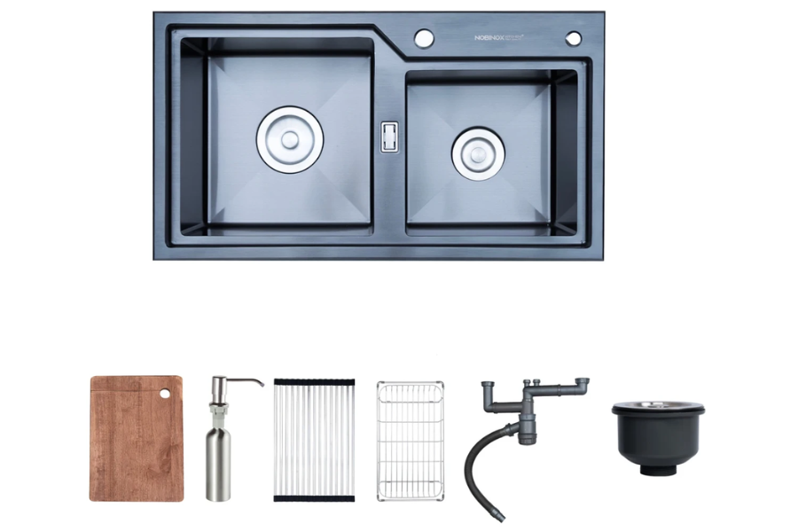 - Chậu thiết kế giật cấp tinh xảo tích hợp phụ kiện bếp đi kèm cùng với công năng đa dạng giúp cho việc vào bếp nhẹ nhàng và đơn giản hơn.