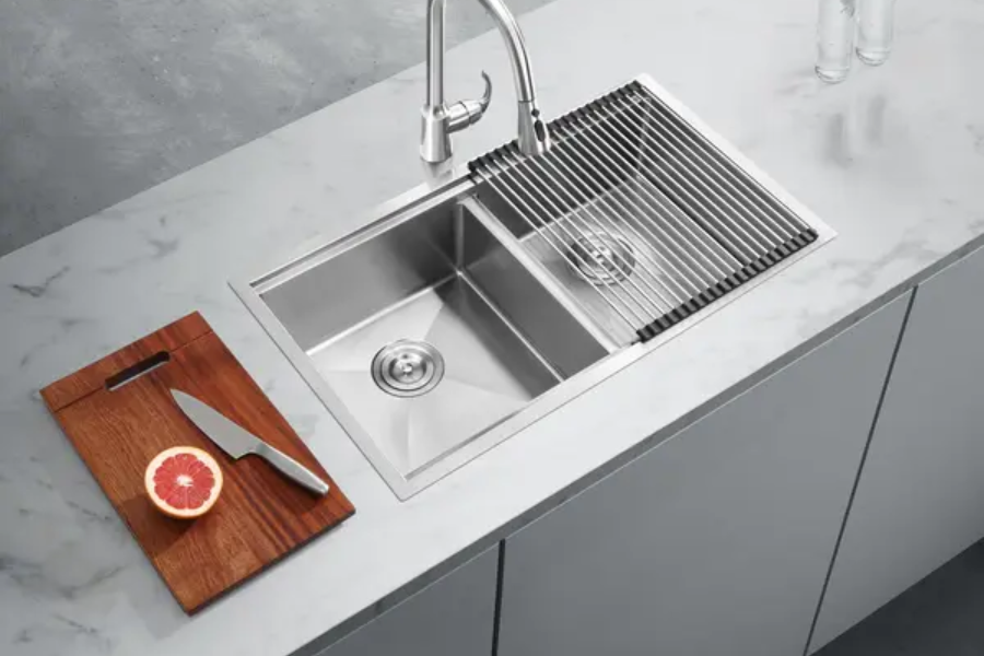 - Chậu thiết kế giật cấp tinh xảo tích hợp phụ kiện bếp đi kèm cùng với công năng đa dạng giúp cho việc vào bếp nhẹ nhàng và đơn giản hơn.