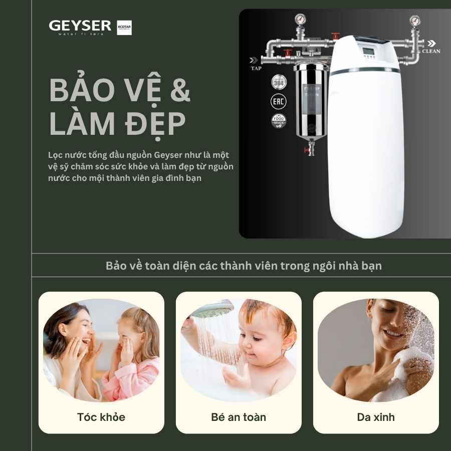- Với việc sử dụng nước qua bộ lọc Geyser hàng ngày, da không bị khô, các đặc tính bảo vệ lớp sừng không bị xâm phạm, và không gây ra các phản ứng dị ứng.