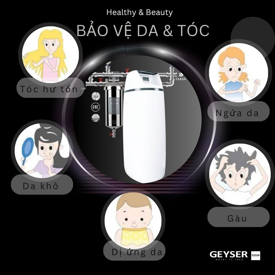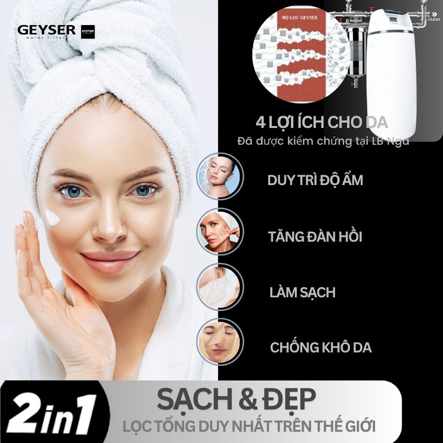 - Nước qua bộ lọc Geyser như là chất tẩy rửa nhẹ nhàng dưỡng ẩm, cải thiện tình trạng da, giúp da khỏe hơn