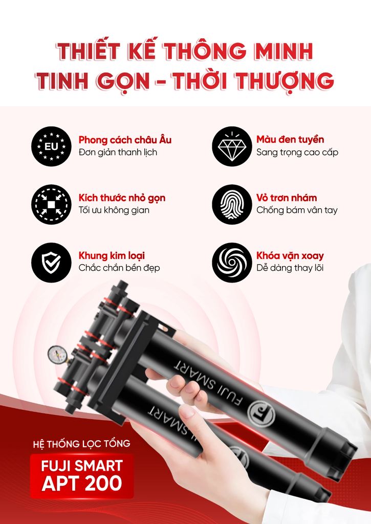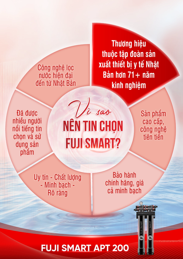 Thương hiệu Fuji Smart, với hơn 71+ năm kinh nghiệm trong sản xuất thiết bị y tế, mang đến hệ thống lọc tổng Fuji Smart APT 200 – Không chỉ đáp ứng tiêu chuẩn Nhật Bản mà còn phù hợp với nhu cầu đa dạng của gia đình Việt Nam từ nấu ăn, nước uống, pha sữa em bé, tắm rửa, vệ sinh, nước cấp máy giặt, nước cấp máy nước nóng, nước cấp máy điện giải Hydro y tế,…