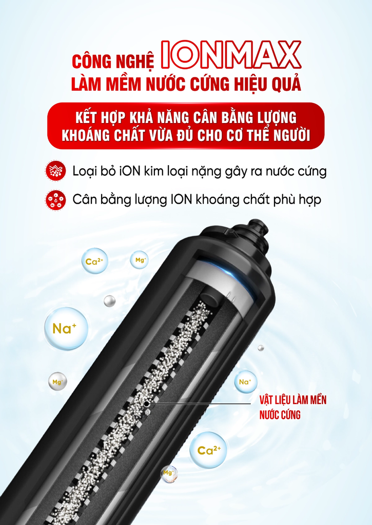 Công nghệ làm mềm nước cứng IONMAX là công nghệ đặc biệt hiệu quả trong việc loại bỏ các ion canxi và magie là các tác nhân làm giảm tuổi thọ của các thiết bị gia dụng và tắc nghẽn đường ống. Với công nghệ IONMAX giúp tiết kiệm thời gian, chi phí sửa chữa các thiết bị gia dụng, giúp quần áo mềm mại, da tóc suôn mượt.