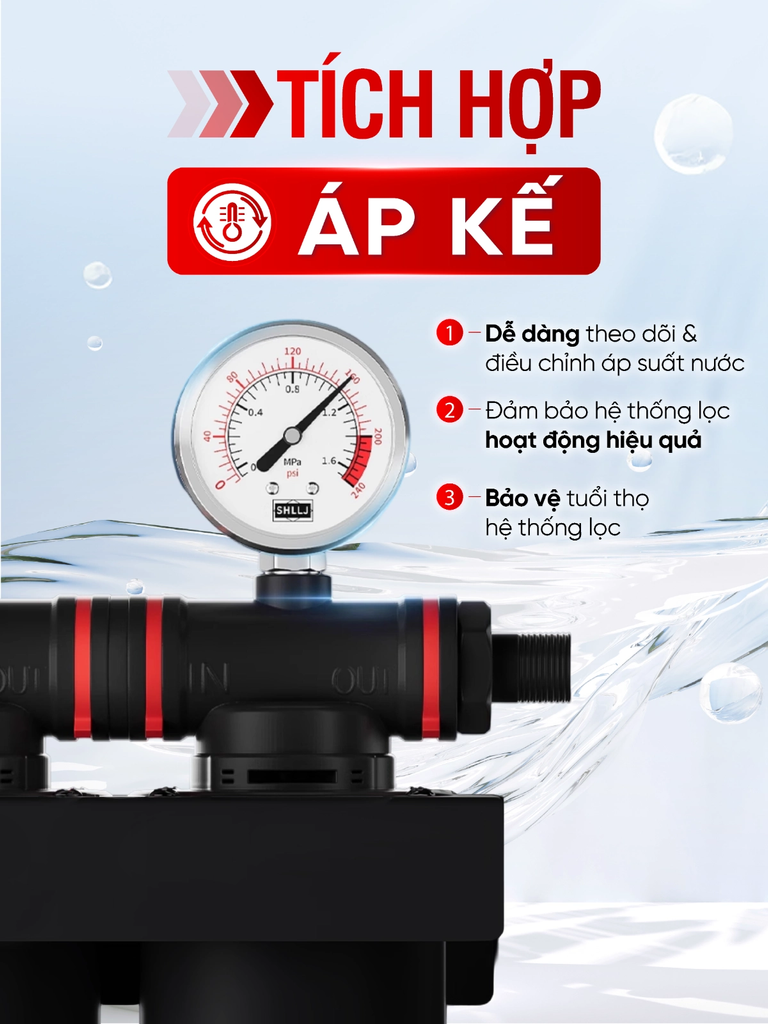 - Theo dõi áp suất nước đầu vào – đầu ra: Áp kế giúp kiểm soát được áp lực nước từ nguồn cấp vào hệ thống. Nếu áp suất quá thấp, nước có thể không đủ mạnh để đi qua các tầng lọc; nếu quá cao dễ gây hư hỏng đường ống, van, lõi lọc.
