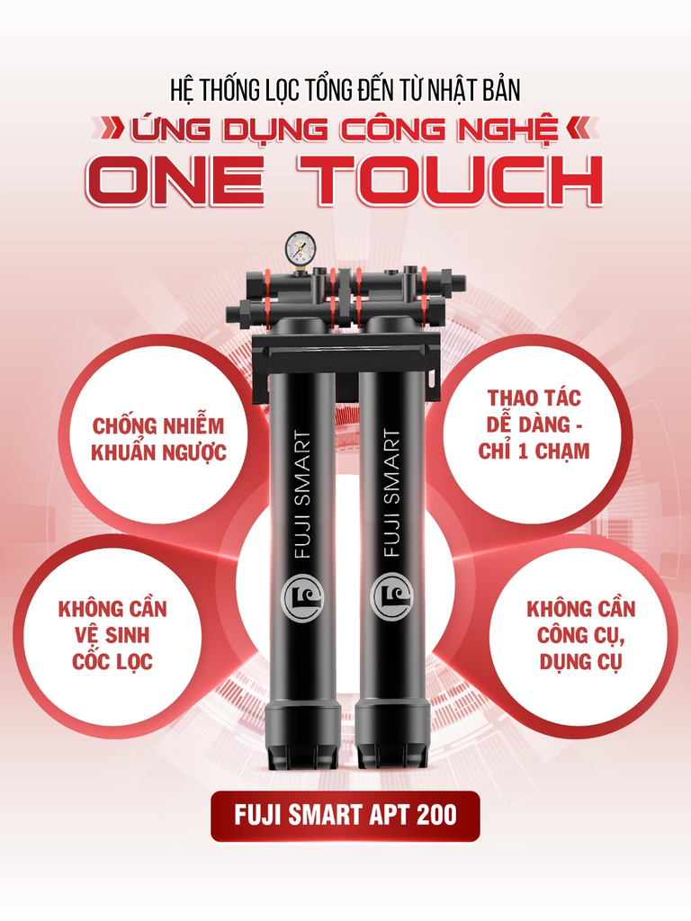 Hệ thống lọc tổng Fuji Smart APT 200 được ứng dụng công nghệ One-Touch giúp dễ dàng thay thế trụ lọc chỉ với vài thao tác xoay