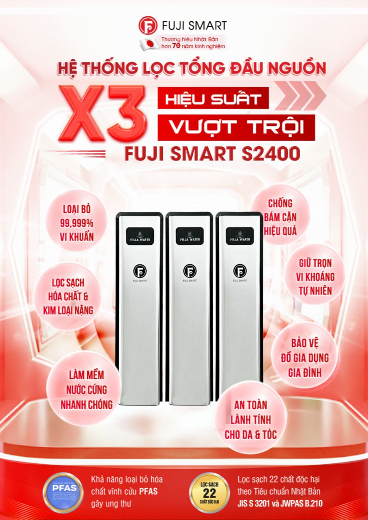 Nguồn nước sinh hoạt gia đình hiện tại có thực sự an toàn? Ô nhiễm nguồn nước đang ngày càng nghiêm trọng, đe dọa đến sức khỏe của cả gia đình. Đầu tư vào hệ thống lọc tổng cao cấp Fuji Smart S2400 là giải pháp tối ưu để loại bỏ các chất độc hại, đảm bảo nguồn nước sạch cho mọi nhu cầu.