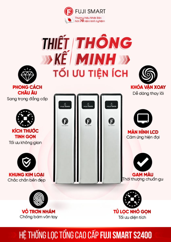 Thương hiệu Fuji Smart, với hơn 72+ năm kinh nghiệm trong sản xuất thiết bị y tế, mang đến hệ thống lọc tổng cao cấp Fuji Smart S2400 – Không chỉ đáp ứng tiêu chuẩn Nhật Bản mà còn phù hợp với nhu cầu đa dạng của gia đình Việt Nam từ nấu ăn, nước uống, pha sữa em bé, tắm rửa, vệ sinh, nước cấp máy giặt, nước cấp máy nước nóng, nước cấp máy điện giải Hydro y tế,…