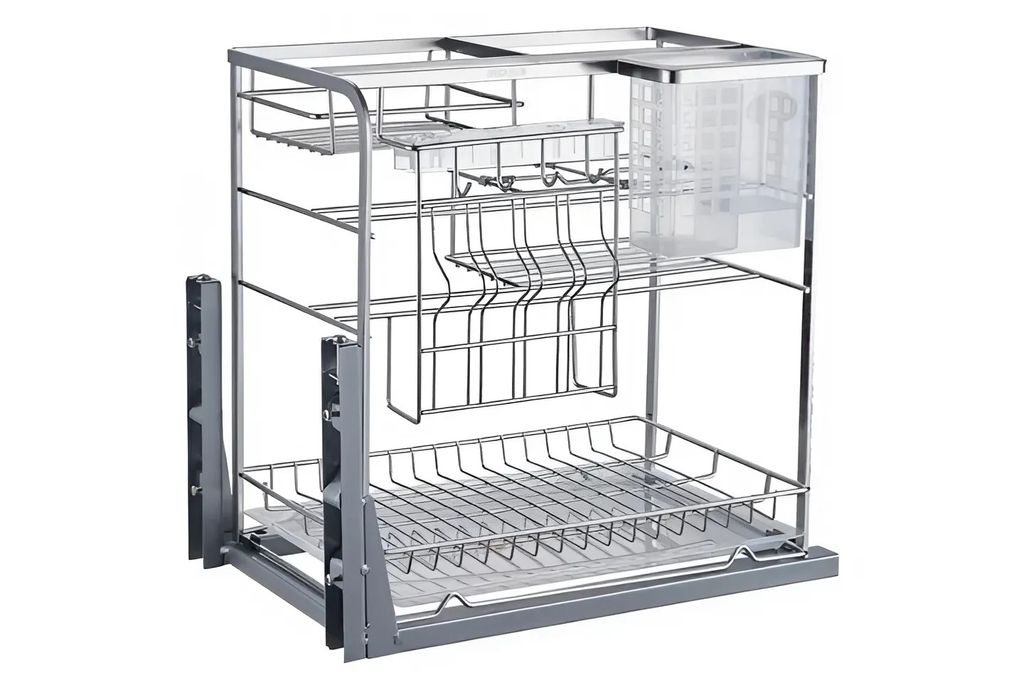 Kệ được thiết kế âm hoàn toàn vào bên trong tủ bếp, giúp tối ưu hóa không gian lưu trữ, đồng thời mang lại sự gọn gàng và tinh tế cho tổng thể gian bếp.
