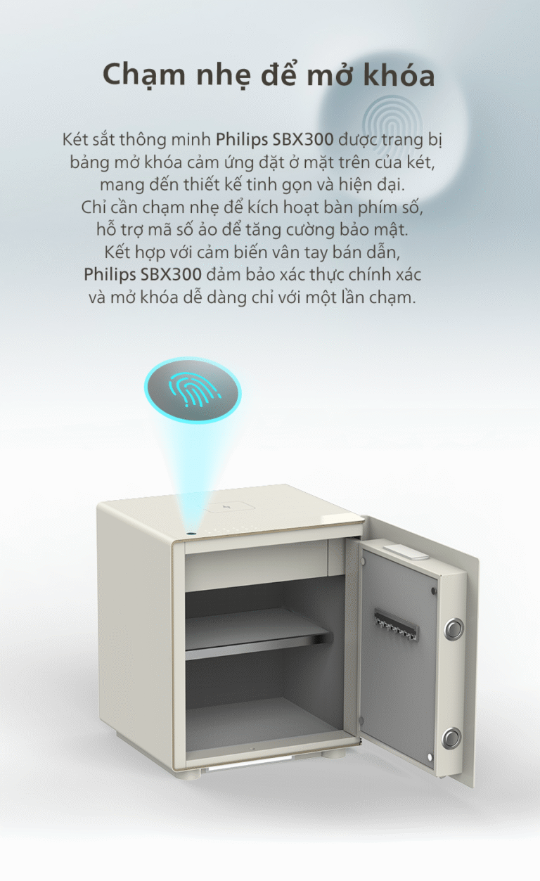 Nếu bạn đang tìm một chiếc két sắt Philips đáp ứng cả nhu cầu an toàn – tiện ích – thẩm mỹ, Philips SBX300 là một lựa chọn rất đáng cân nhắc. Sản phẩm sử dụng khu vực cảm ứng đặt trên mặt két để kích hoạt bàn phím và mở khóa, đi kèm mã ảo chống nhìn trộm và cảm biến vân tay FPC Thụy Điển, nổi tiếng về tốc độ và độ ổn định trong ngành an ninh.