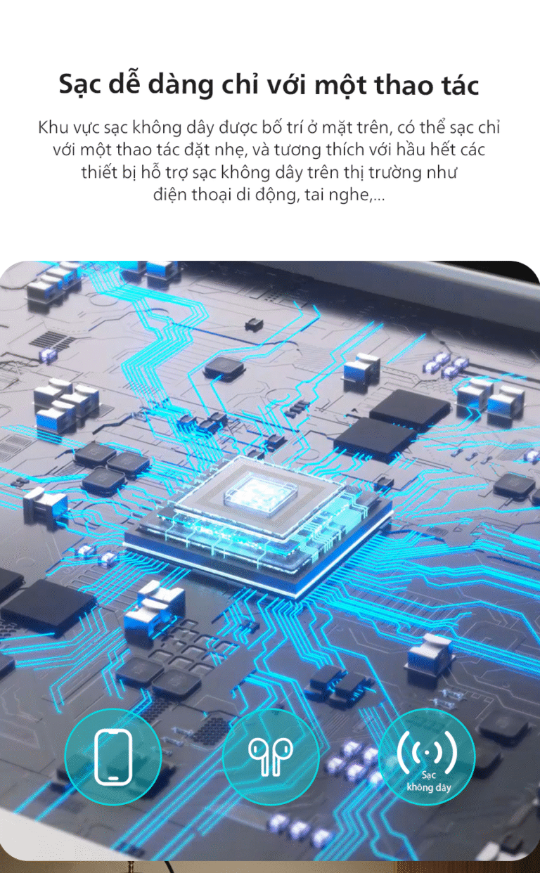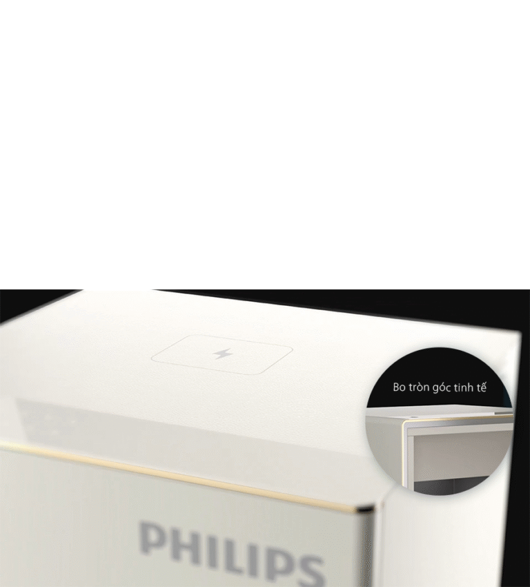 Nối tiếp triết lý “tiện ích tinh gọn” của dòng SBX300, Philips đặt khu vực sạc không dây ngay trên mặt két. Chỉ cần đặt điện thoại, tai nghe hay đồng hồ thông minh lên bề mặt là thiết bị tự động nạp pin ổn định không dây cáp, không ổ cắm vướng víu. Với cách bố trí này, mặt két đóng vai trò như một station sạc mini luôn sẵn sàng, rất phù hợp đặt ở đầu giường hoặc trong không gian nghỉ ngơi.