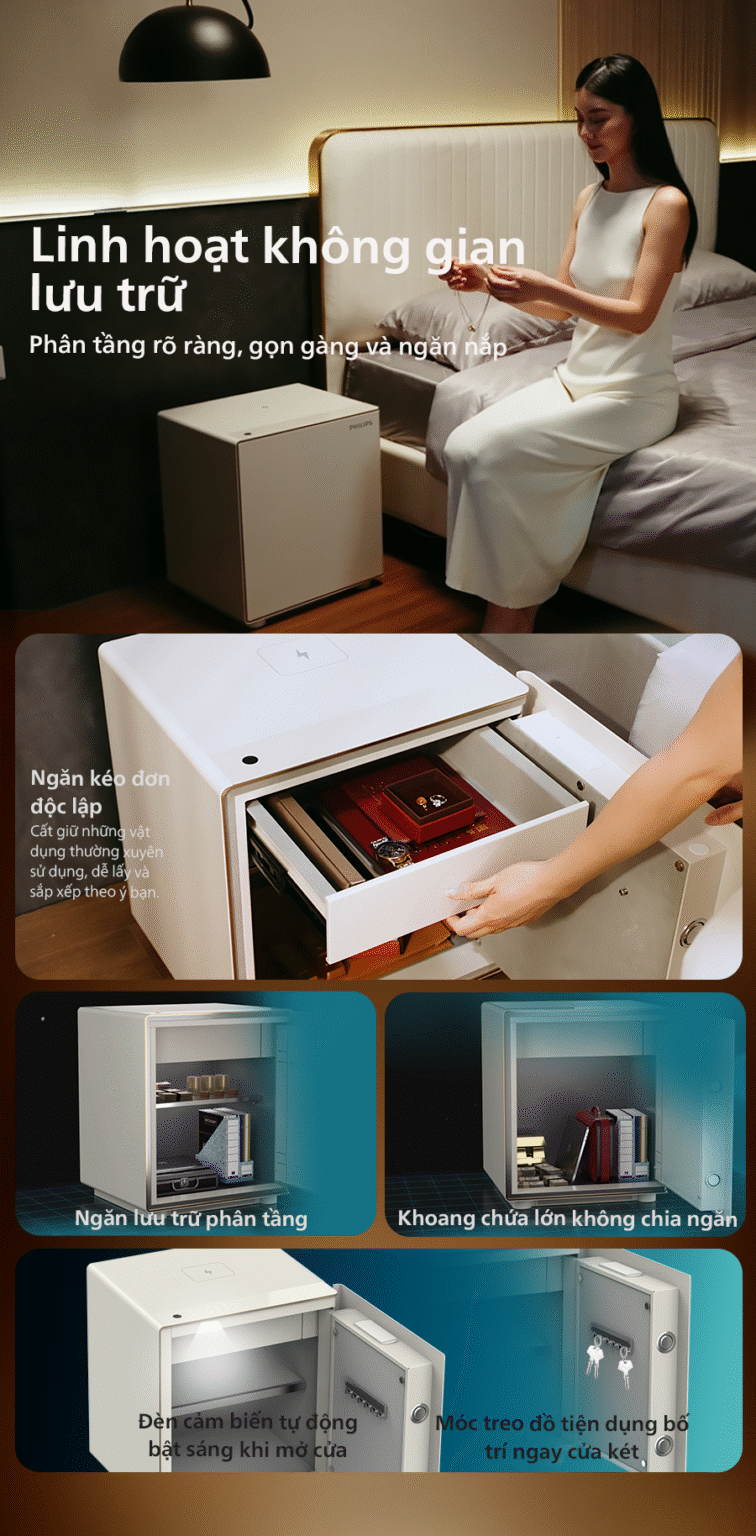 Điểm mình đặc biệt đánh giá cao là thiết kế phẳng, liền lạc của cụm sạc giúp khu vực phòng ngủ trông sạch sẽ và hiện đại hơn hẳn. Đây là kiểu tiện ích nhỏ nhưng mang lại giá trị sử dụng mỗi ngày đúng tinh thần của Philips khi biến một chiếc két an toàn thành một món nội thất cao cấp, thân thiện và tinh tế.