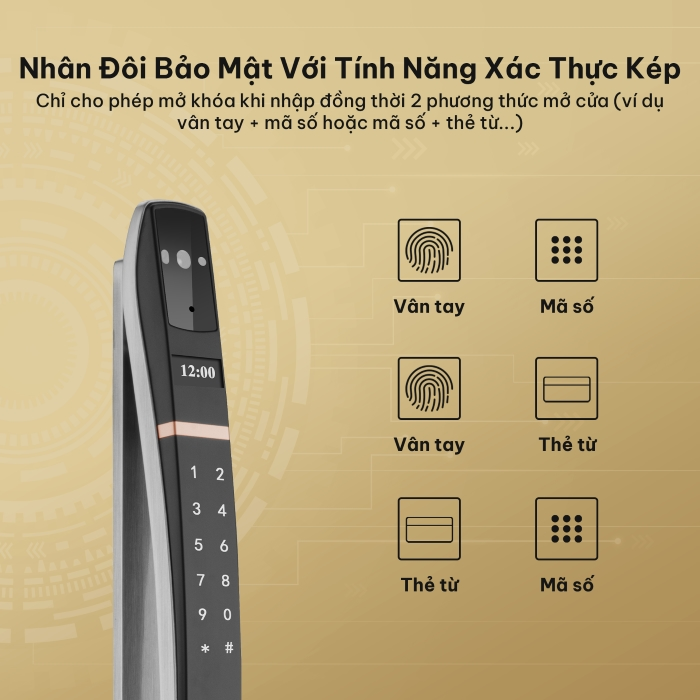 Hexa P300-Pro được trang bị chế độ bảo mật kép, yêu cầu người dùng thực hiện hai bước xác thực liên tiếp để mở khóa. Tính năng này đặc biệt hữu ích trong các tình huống cần bảo mật cao như cửa chính nhà phố, cổng biệt thự, văn phòng có hồ sơ quan trọng hoặc phòng ngủ để két sắt. Cơ chế xác thực kép giúp hạn chế tối đa nguy cơ bị xâm nhập trái phép, đảm bảo sự an toàn tuyệt đối cho không gian sống.