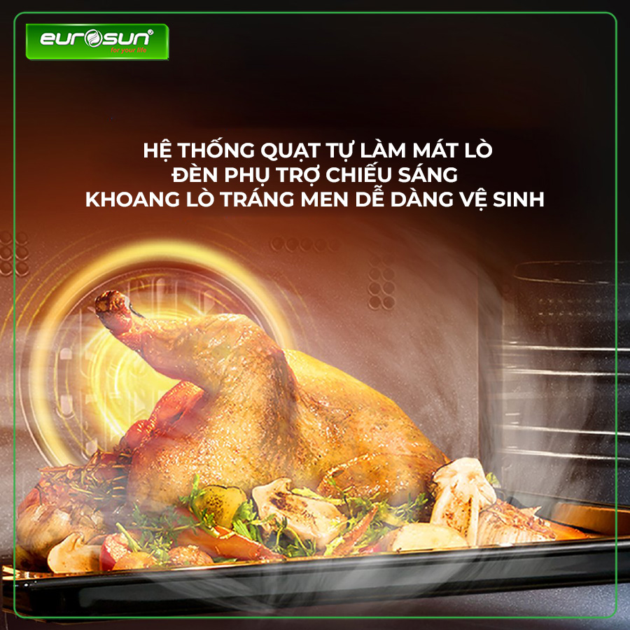 Lò nướng Eurosun EOV65D nhập khẩu nguyên chiếc từ Malaysia là sản phẩm lò nướng cao cấp, dung tích 65L và phù hợp sử dụng cho đại đa số gia đình Việt.Với thiết kế sang trọng, sử dụng vật liệu cao cấp nhất trong ngành thực phẩm là Inox 304 (18/10) kết hợp kính cường lực đen chống bám bẩn và vân tay, tạo vẻ ngoài sang trọng và cuốn hút. Lò có hệ thống quạt tự làm mát hiệu quả và đèn phụ trợ chiếu sáng khoang lò.