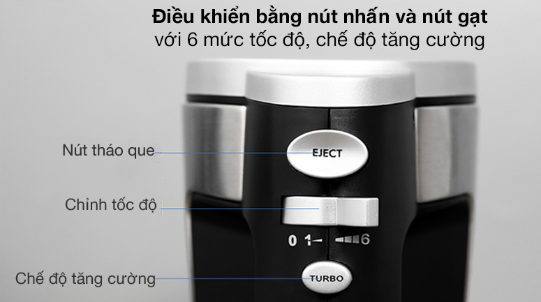 Điều khiển nút nhấn và nút gạt đơn giản với 6 mức tốc độ tùy chỉnh theo nhu cầu, để thành phẩm có độ mịn, độ sánh hay đánh bông đạt yêu cầu nhất