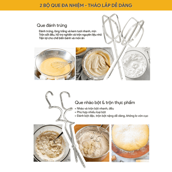 Máy được trang bị bộ que đánh trứng và que nhào bột bằng thép mạ crôm, đảm bảo an toàn khi tiếp xúc thực phẩm và có độ bền cao.