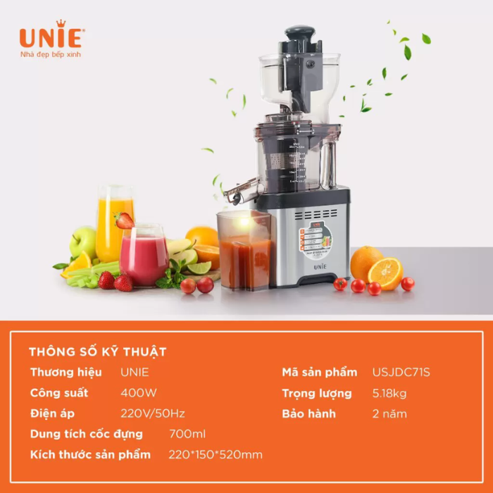 May ép chậm USJDC71S là dòng máy ép chậm cao cấp của Unie, sở hữu thiết kế nổi bật và công năng mạnh mẽ, tốc độ vòng quay chỉ 45 vòng mỗi phút giúp ép kiệt bã và giữ nguyên hương vị, màu sắc cùng chất dinh dưỡng trong nguyên liệu.