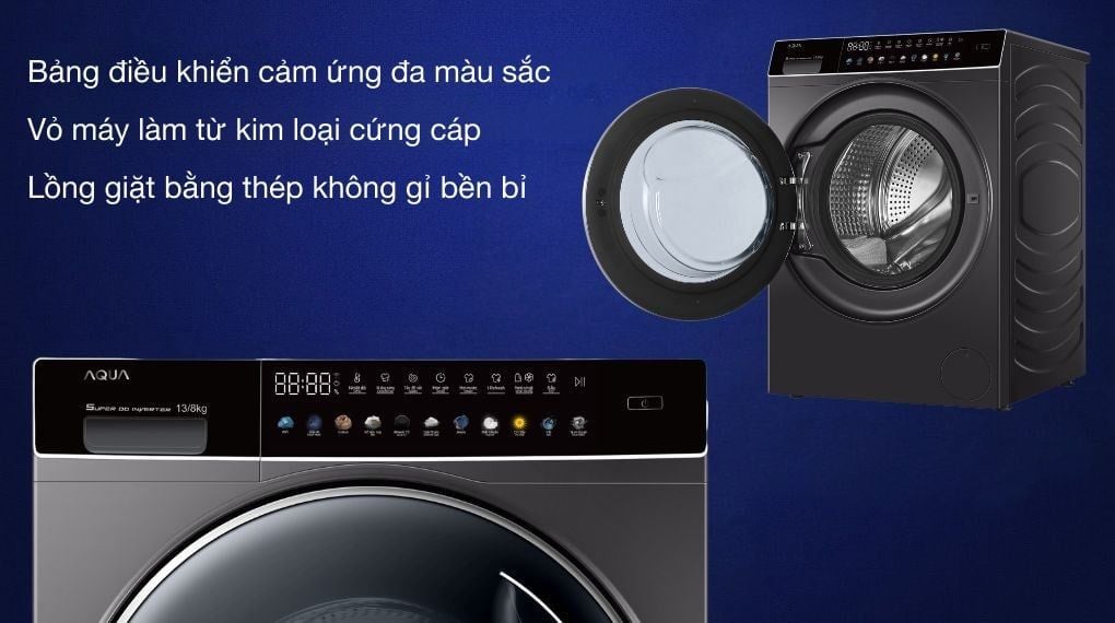 - Với khối lượng giặt 13 kg, máy giặt Aqua đáp ứng tốt nhu cầu giặt giũ của các gia đình có hơn 7 thành viên. Khả năng sấy 8 kg sẽ giúp bạn tiết kiệm thời gian phơi đồ trong những ngày thời tiết ẩm ướt hay mưa, ngăn ngừa quần áo bị ẩm mốc và mùi khó chịu.