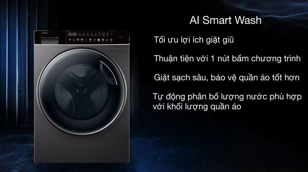 - Máy được trang bị 10 chương trình hoạt động như: giặt AI, giặt đồ hỗn hợp, giặt diệt khuẩn,... Trong đó chương trình giặt AI giúp máy xác định được khối lượng đồ đang giặt từ đó phân bổ nước giặt hợp lý, giúp quần áo sạch sâu và tối ưu chi phí giặt giũ.