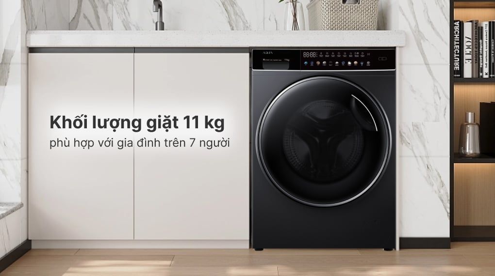 - Máy giặt Aqua sở hữu thiết kế hài hoà, được hoàn thiện với chất liệu thép không gỉ với tone màu đen sang trọng, dễ dàng phù hợp với những vật dụng khác trong nhà.