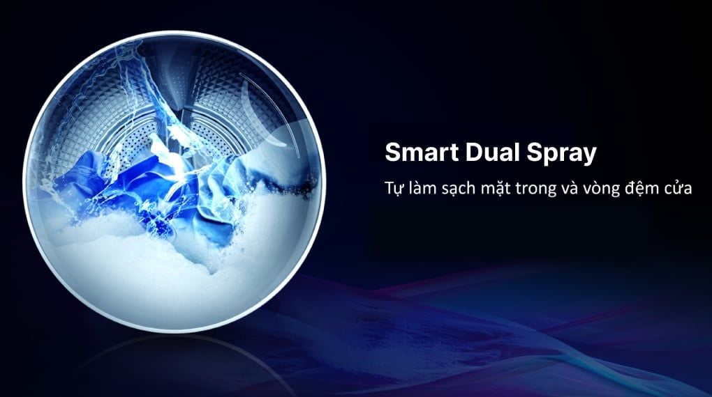- Smart Dual Spray giúp loại bỏ xơ vải, mảng bám ở mặt trong cửa và vòng đệm sau mỗi lần giặt.