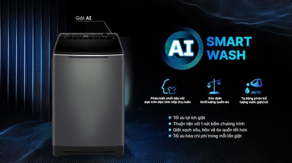 - Công nghệ AI Smart Wash dựa trên đặc tính hấp thụ nước của quần áo mà công nghệ giúp phân biệt các loại vải, các loại quần áo. Không những thế, chức năng này còn giúp tự động tính toán khối lượng giặt giúp quá trình giặt được tối ưu, giặt sạch sâu, bảo vệ quần áo được tốt hơn.