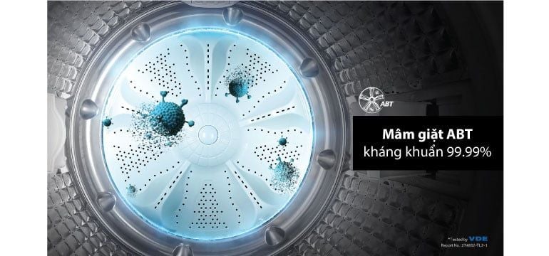Mâm giặt của máy giặt Aqua làm từ chất liệu có khả năng kháng khuẩn đến 99.99% được phun vào mâm giặt, ngăn chặn sự phát triển của vi khuẩn và nấm mốc