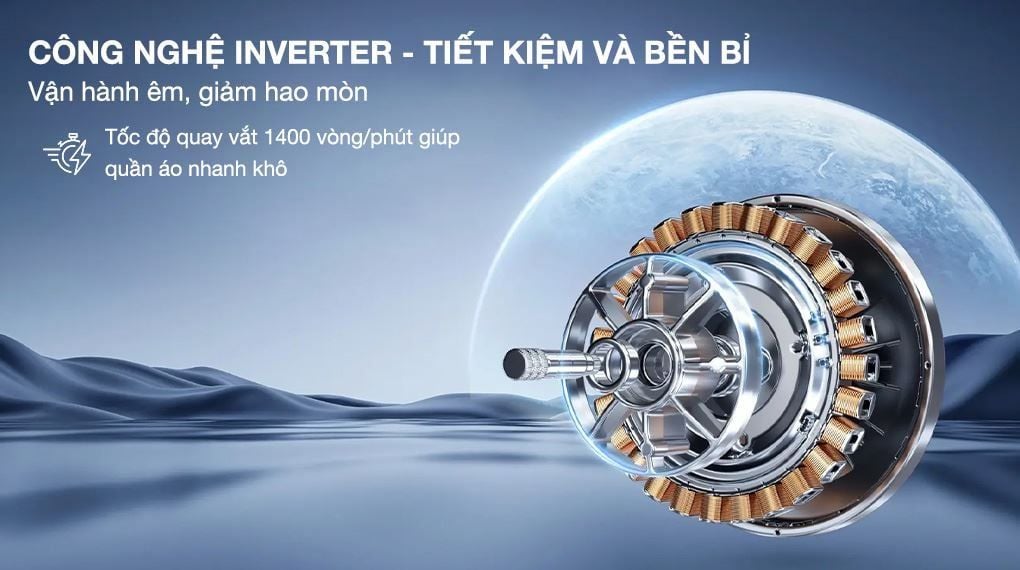 Máy trang bị động cơ truyền động trực tiếp Inverter, vận hành êm ái, bền bỉ và tiết kiệm điện năng. Nhờ công nghệ tiên tiến, máy giúp tối ưu chi phí điện hàng tháng mà vẫn đảm bảo hiệu quả giặt sạch.