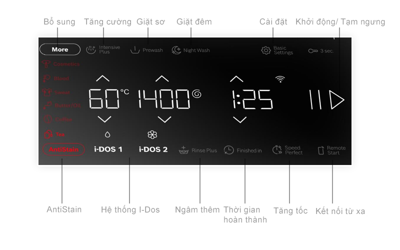 - Intensive Plus: Kéo dài thời gian giặt để xử lý các loại quần áo đặc biệt bẩn.