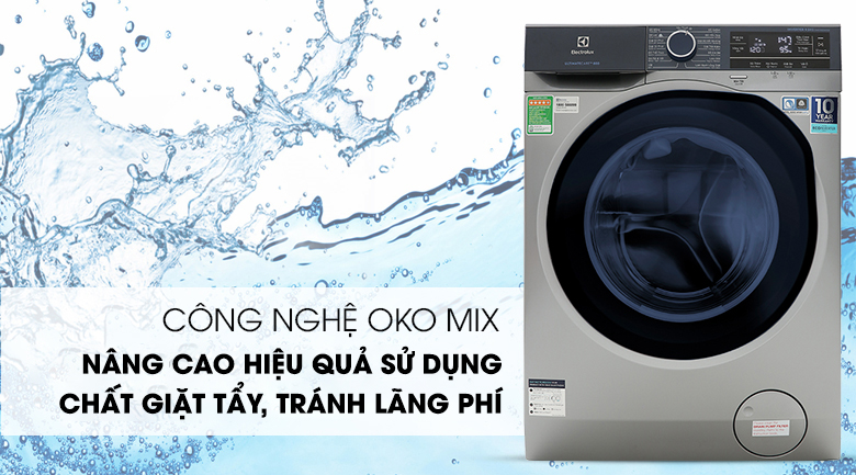 Electrolux đã trang bị công nghệ Oko Mix với khả năng kiểm soát tối ưu lượng nước giặt, nước xả khi vận hành giúp người dùng yên tâm sử dụng mà không cần lo lắng về việc lãng phí chất giặt tẩy mà vẫn đảm bảo quần áo được giặt sạch tối ưu.
