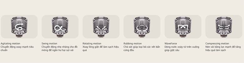 Máy giặt LG mô phỏng 6 chuyển động giặt khác nhau như giặt đập, giặt quay, giặt nén, giặt nhào trộn,… giúp quần áo được làm sạch tối ưu mà vẫn giữ được độ bền của sợi vải. Công nghệ này đặc biệt hữu ích cho những loại vải mỏng, đồ trẻ em hay trang phục cao cấp.