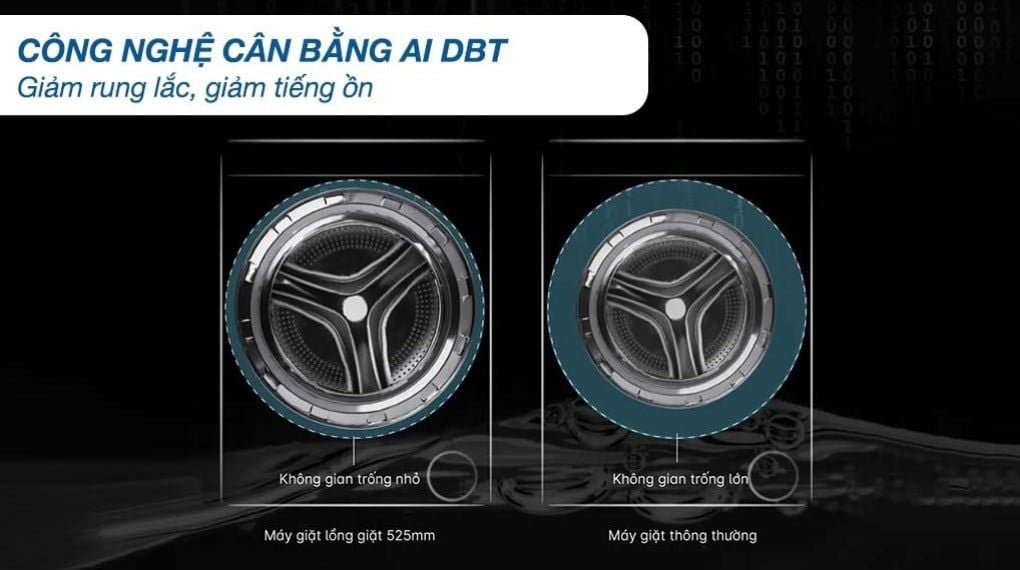 - Công nghệ cân bằng AI DBT sử dụng trí tuệ nhân tạo AI giúp cảm nhận được chính xác biên độ quay và độ lệch tâm, nhờ đó điều chỉnh tốc độ quay của lồng giặt được linh hoạt và chính xác đảm bảo máy giặt vận hành êm ái, giảm rung lắc nhưng vẫn đảm bảo hiệu quả giặt sạch.