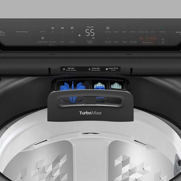 - Turbo Mixer giúp đánh tan bột giặt hoàn toàn trước khi đưa vào lồng giặt, đảm bảo không để lại cặn trên vải, phù hợp với cả bột giặt và nước giặt.