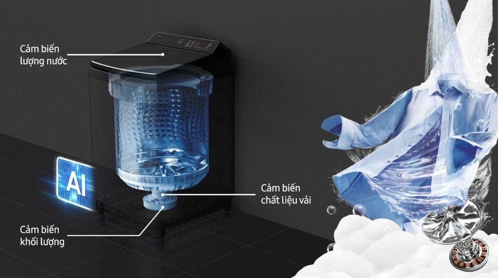 - Giặt AI giúp cảm biến khối lượng và chất liệu vải, từ đó điều chỉnh lượng nước, thời gian và chuyển động giặt phù hợp, nâng cao hiệu quả giặt sạch và bảo vệ sợi vải.