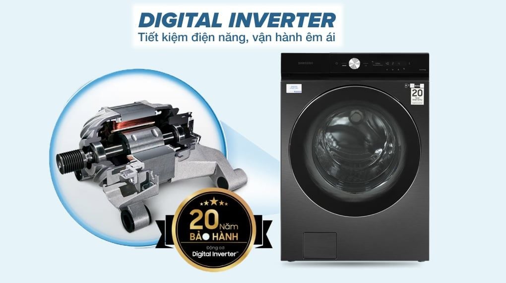 - Công nghệ Digital Inverter: Sử dụng nam châm vĩnh cửu có khả năng giảm thiểu ma sát động cơ trong suốt quá trình vận hành, nhờ đó giúp máy giặt được vận hành êm ái và sử dụng ít điện năng hơn mà vẫn mang lại hiệu quả giặt sạch quần áo tối ưu.