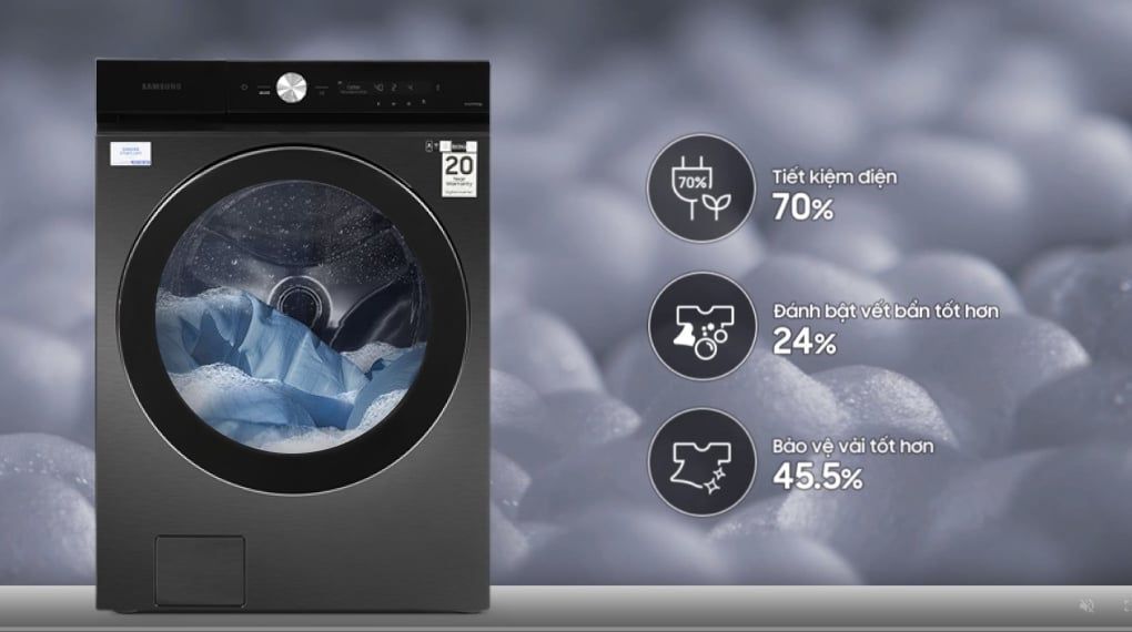 - Công nghệ giặt bong bóng Eco Bubble: Có khả năng tạo ra những bong bóng siêu mịn, giúp tăng khả năng thẩm thấu gấp 40 lần của nước giặt tẩy vào sâu bên trong sợi vải, từ đó hỗ trợ đánh bay vết bẩn trên quần hiệu quả hơn 24%, đồng thời giảm thiểu tối đa tình trạng đóng cặn và loại bỏ vết loang của chất tẩy.