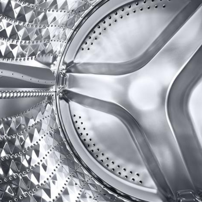 Lồng giặt được chế tạo từ thép không gỉ, có độ bền cao, chống ăn mòn và hạn chế bám bẩn, đồng thời an toàn cho quần áo khi ma sát trong quá trình giặt.