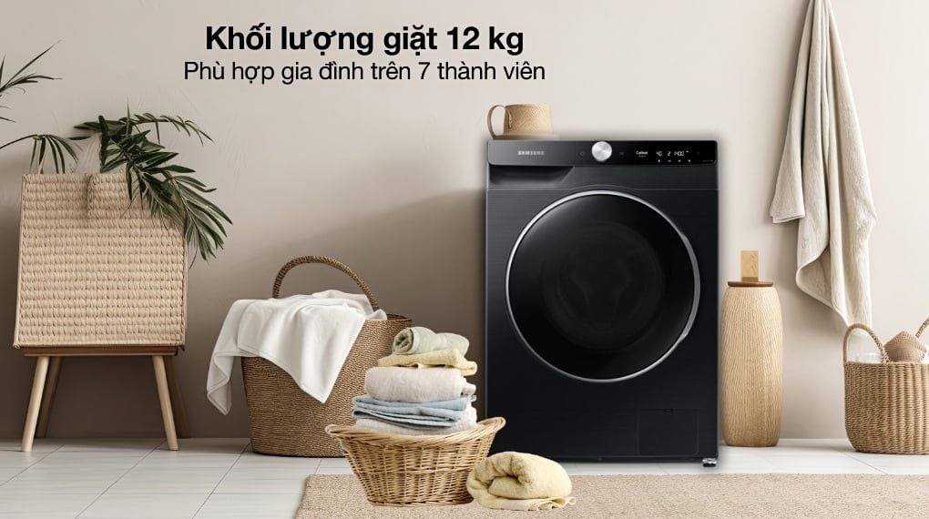 - Máy có khối lượng giặt 12kg, đáp ứng tốt nhu cầu giặt giũ của gia đình trên 7 người hoặc những gia đình ít người nhưng có nhu cầu giặt nhiều.