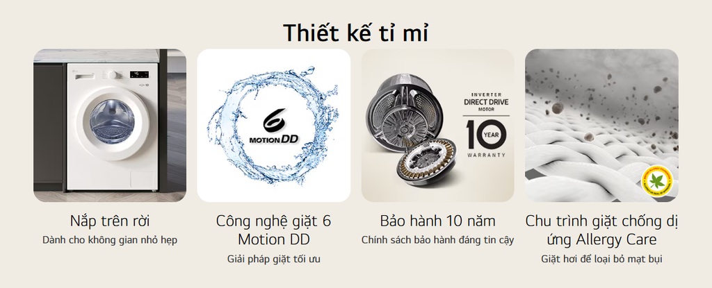 Công nghệ giặt 6 Motion DD mô phỏng các chuyển động giặt tay, giúp quần áo được làm sạch nhẹ nhàng, hạn chế xoắn rối và giữ cho sợi vải bền đẹp hơn.
