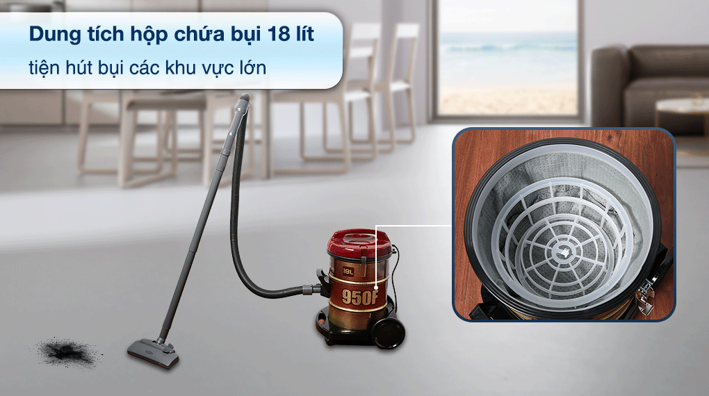 - Dung tích hộp chứa bụi tới 18 lít tiện lợi để làm sạch các khu vực có diện tích lớn giúp tiết kiệm thời gian vệ sinh.