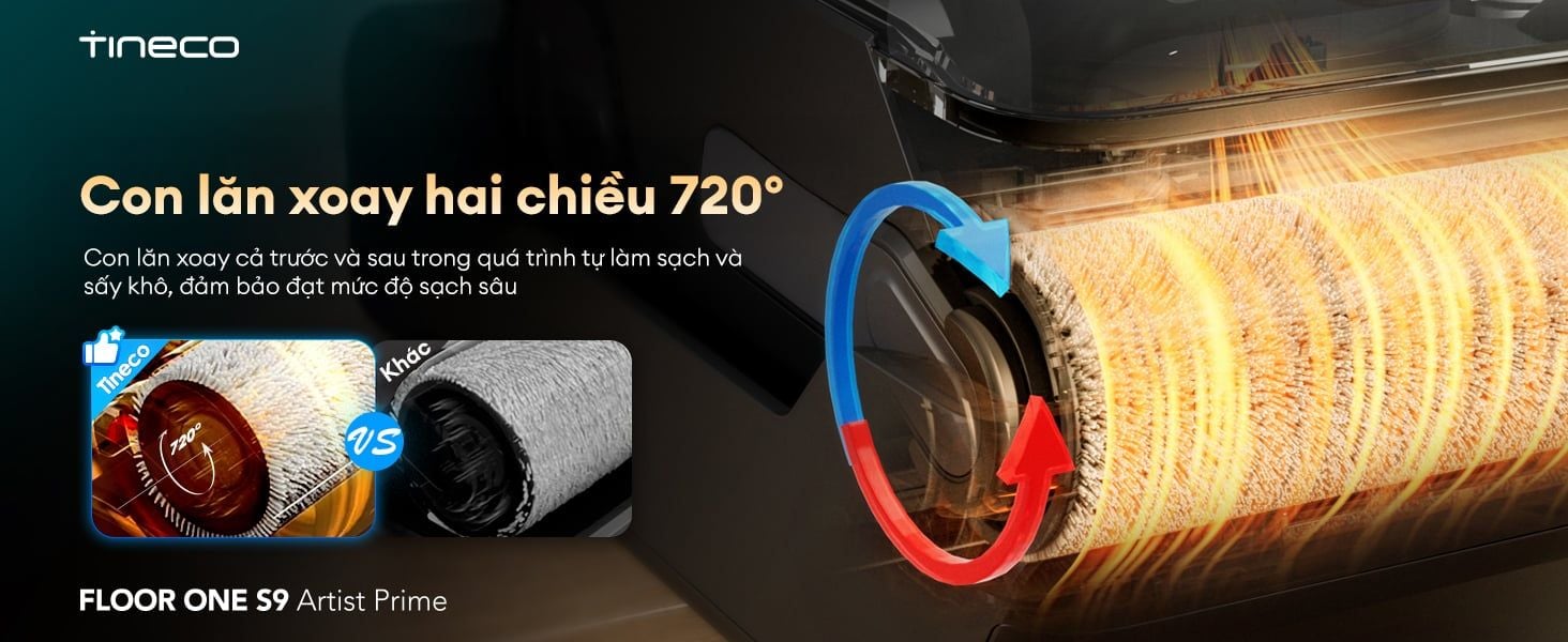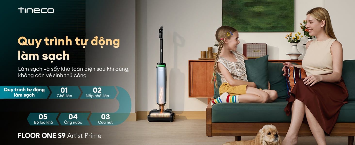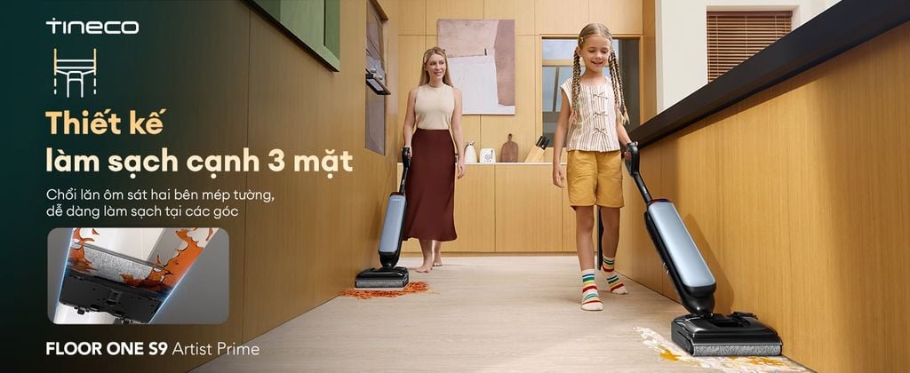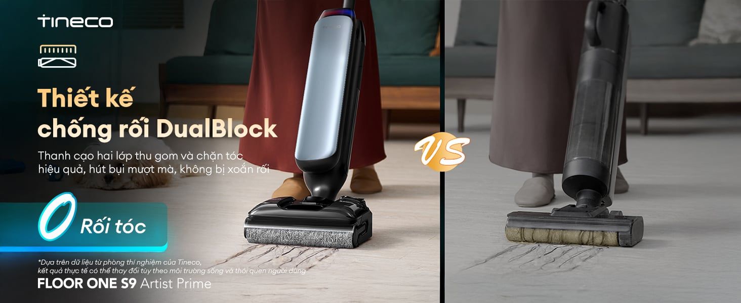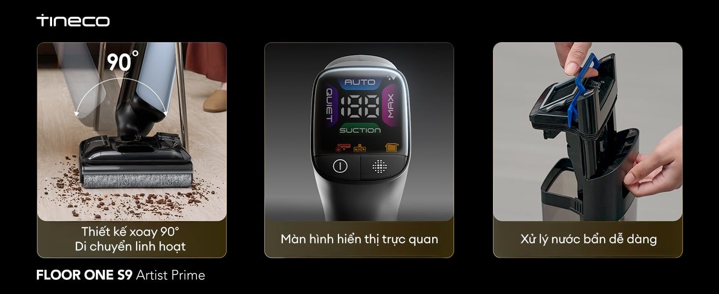 Công nghệ chống rối DualBlock độc quyền và khả năng làm sạch ba mặt cạnh, giúp xử lý gọn gàng mọi loại bụi bẩn, lông/tóc rụng ở các góc tường và cạnh đồ nội thất. Với thiết kế nằm phẳng 180° cho phép Tineco S9 Artist Prime dễ dàng len lỏi dưới gầm bàn ghế thấp. Máy tích hợp chức năng tự động làm sạch FlashDry, giúp giặt sạch, làm khô chổi lăn và bảo trì thiết bị một cách hiệu quả và nhanh chóng. Tineco - Tự hào là thương hiệu máy hút bụi lau nhà khô ướt số 1 thế giới trong 3 năm liên tiếp (Nguồn: Euromonitor International - Theo doanh thu bán lẻ toàn cầu của dòng máy hút bụi lau nhà khô ướt gia dụng năm 2022, 2023 và 2024), cam kết mang lại trải nghiệm làm sạch vượt trội và đáng tin cậy.