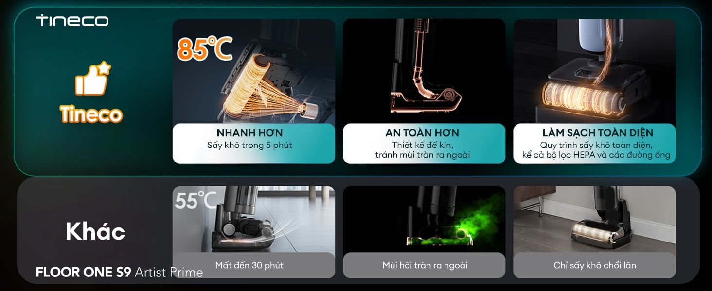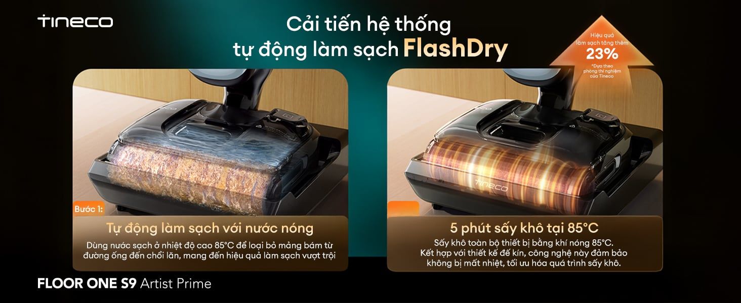 Máy hút bụi Tineco S9 Artist Prime tự động làm sạch bằng nước nóng và sấy khô trong 5 phút với khí nóng 85℃