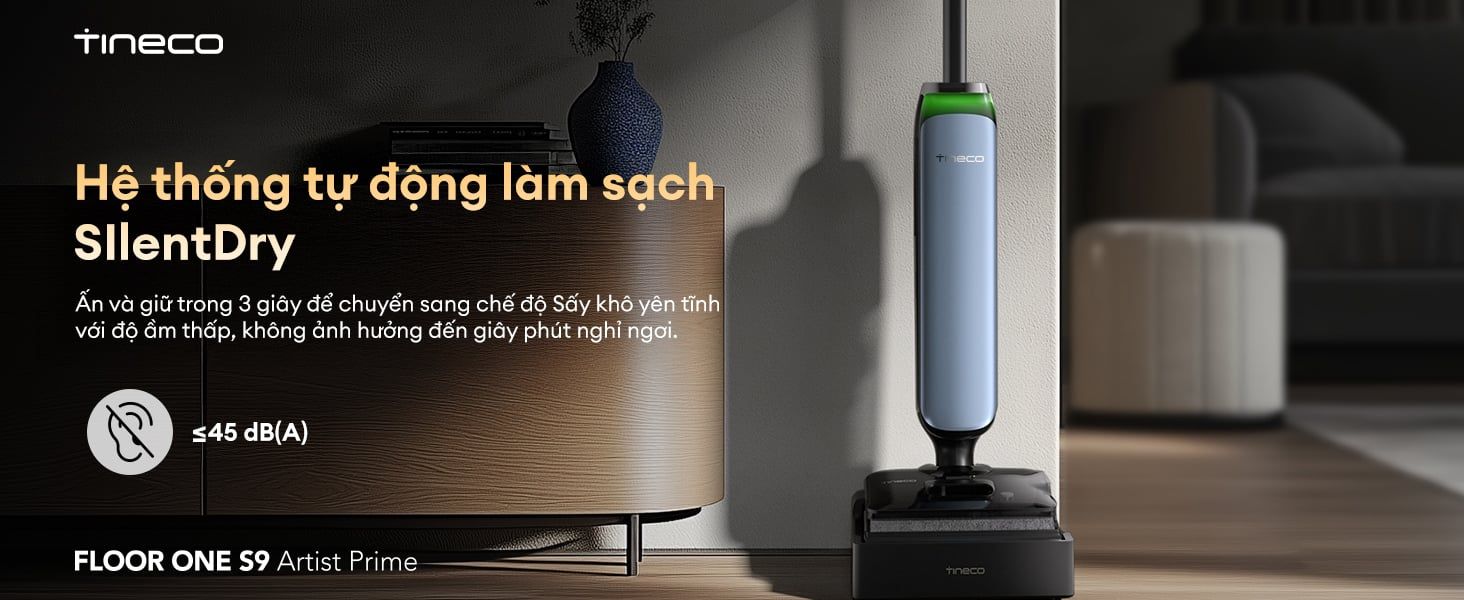 Ngoài ra, máy hút bụi lau sàn khô ướt Tineco FLOOR ONE S9 Artist Prime còn được trang bị chế độ tự động làm sạch yên tĩnh với độ ồn tối đa chỉ ≤45 dB(A), đảm bảo quá trình vệ sinh không gây phiền nhiễu đến thời gian nghỉ ngơi của bạn. Để kích hoạt chế độ này, người dùng chỉ cần nhấn và giữ nút trong 3 giây để chuyển sang quy trình tự động làm sạch với tiếng ồn được giảm thiểu tối đa.