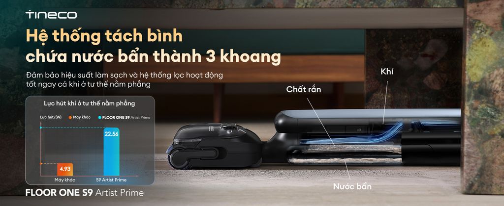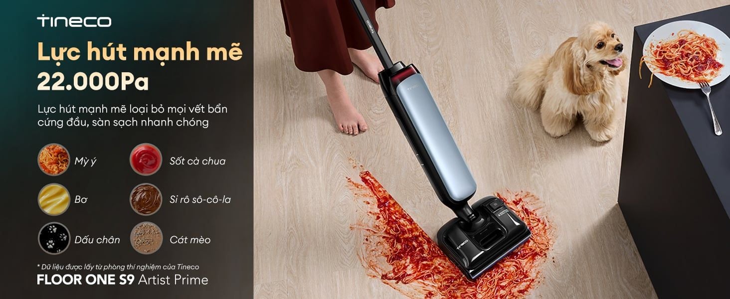 Tineco S9 Artist Prime lực hút mạnh mẽ 22.000Pa, hút sạch mọi loại bẩn khô và ướt