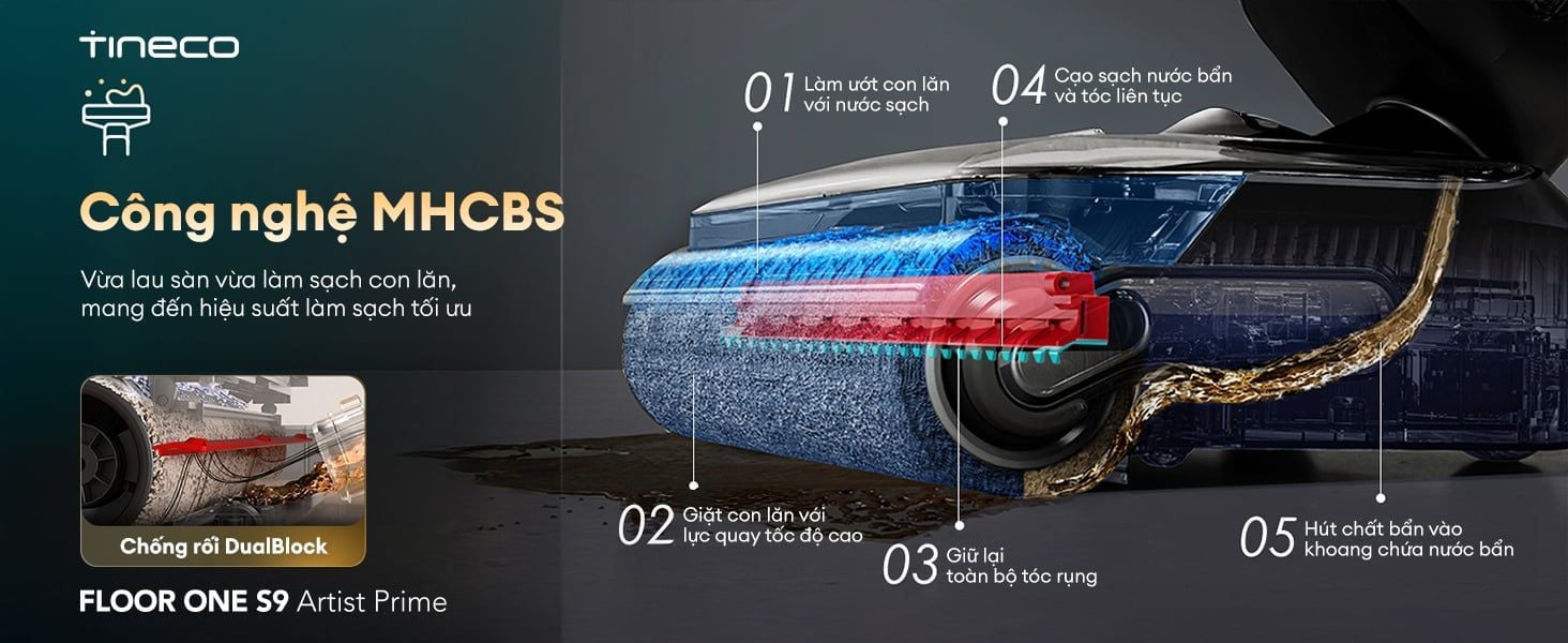 Công nghệ MHCBS độc quyền, mang đến khả năng vừa lau sàn vừa tự động làm sạch con lăn liên tục, đảm bảo hiệu suất làm sạch tối ưu. Công nghệ này thực hiện một quy trình tự động 5 bước cực kỳ hiệu quả: