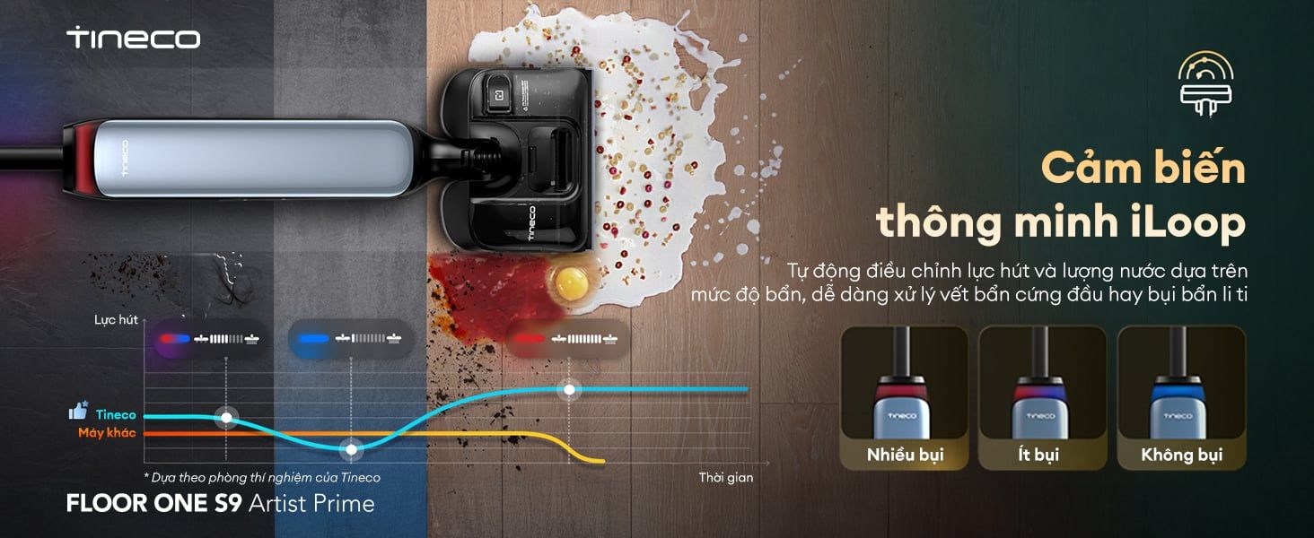 Điểm ưu việt của FLOOR ONE S9 Artist Prime là cảm biến thông minh Tineco iLoop độc quyền, cho phép máy tự động hoạt động một cách hiệu quả và tối ưu nhất. Công nghệ này có khả năng nhận diện mức độ bẩn trên sàn nhà theo thời gian thực và tự động điều chỉnh linh hoạt lực hút cùng lượng nước sử dụng. Nhờ đó, máy dễ dàng xử lý mọi loại vết bẩn, từ bụi bẩn li ti cho đến các vết bẩn cứng đầu, giúp người dùng hoàn toàn rảnh tay và tiết kiệm năng lượng pin.