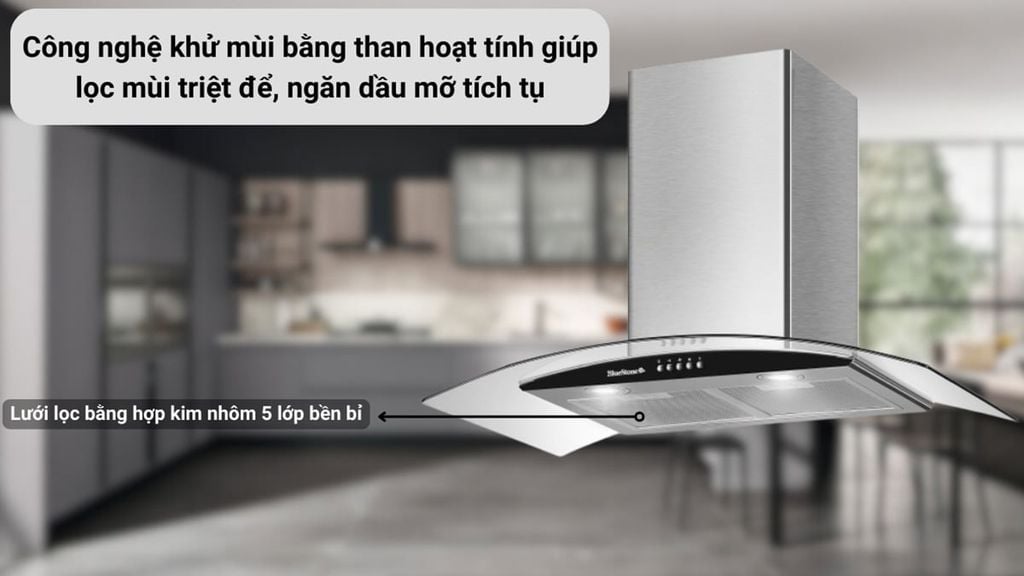 Máy hút mùi BlueStone HOB-8733 kính cong được trang bị lưới lọc bằng hợp kim nhôm 5 lớp bền bỉ, kết hợp cùng công nghệ khử mùi bằng than hoạt tính giúp lọc mùi triệt để, ngăn dầu mỡ tích tụ và hoạt động bền tốt hơn.