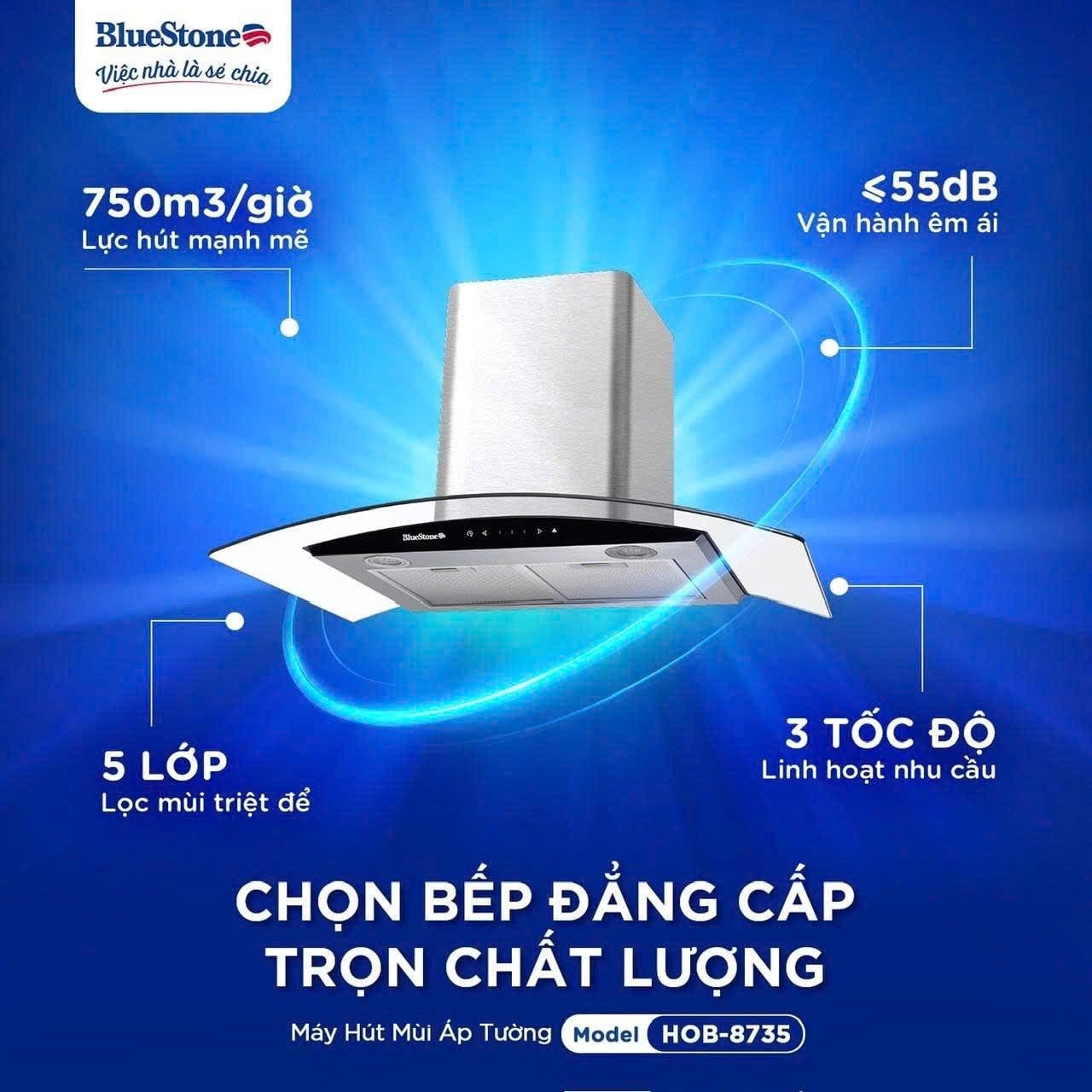 Máy hút mùi BlueStone HOB-8735 kính cong có thiết kế đẹp, điều khiển cảm ứng hiện đại, hút mùi hiệu quả với công suất hút lớn, dễ dàng lắp đặt tùy theo không gian sử dụng, hỗ trợ cho căn bếp luôn trong lành, thoáng mát.
