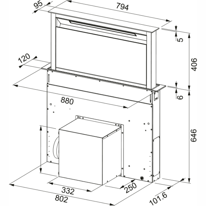 Máy hút mùi FDW 908 IB XS được đặt phía sau bếp nấu và nâng lên khỏi mặt bàn chỉ bằng một lần chạm. Động cơ cho máy hút mùi ẩn bên trong hệ tủ bên dưới bếp nấu ăn, có thể được thông hơi ra bên ngoài qua ống dẫn hoặc thiết lập ở chế độ tuần hoàn. Đây là giải pháp lý tưởng cho việc ẩn máy hút mùi một cách trang nhã trên mặt bếp.